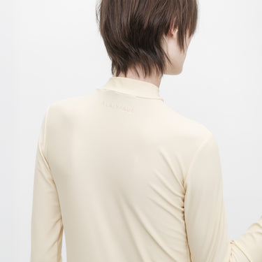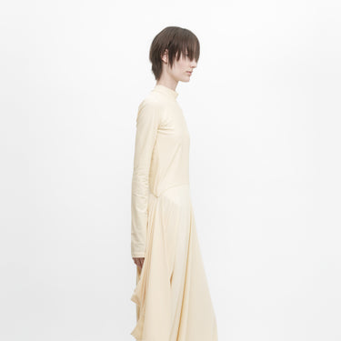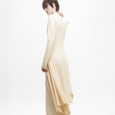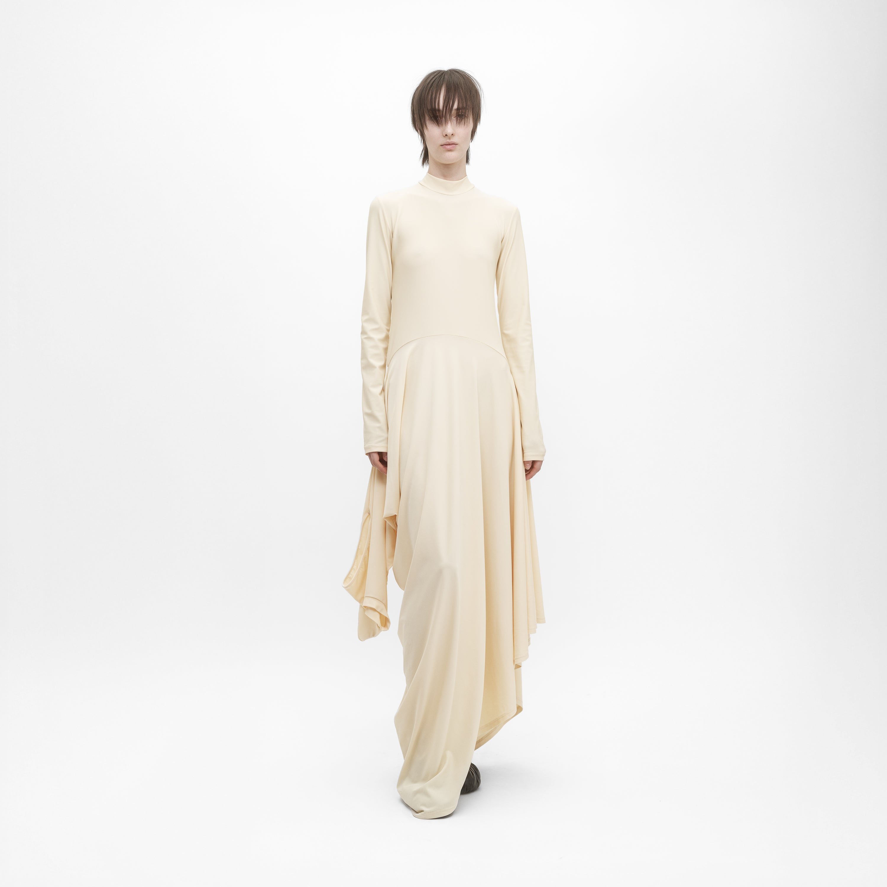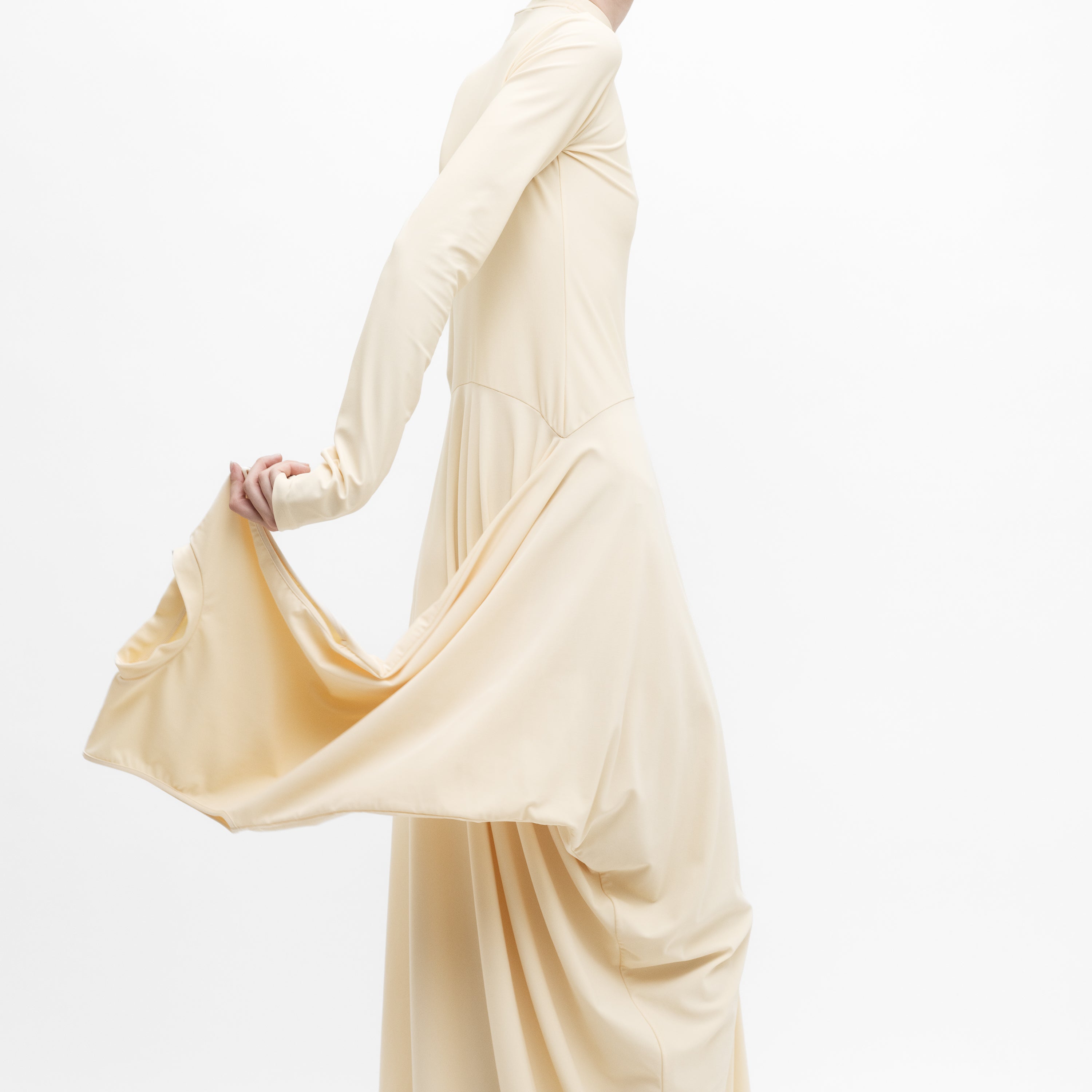 Long-sleeve pivoted dress in matte yellow Lycra. Constructed from the volume of two overlapping dresses, creating a fluid drape that extends from knee length down to the ankle.