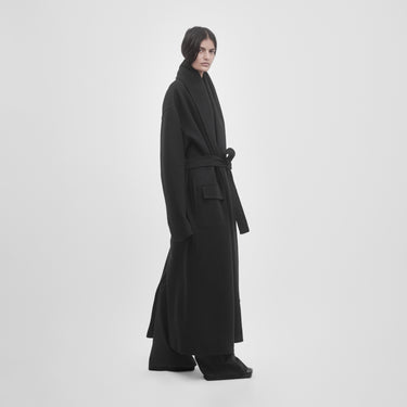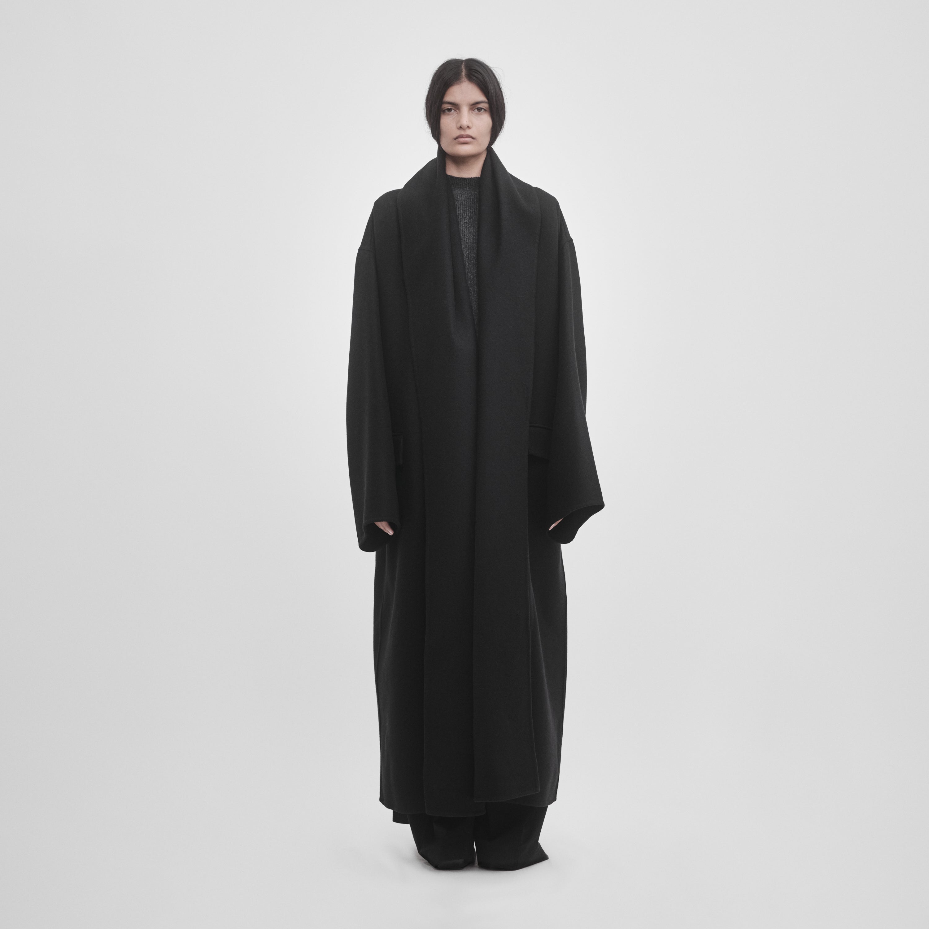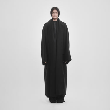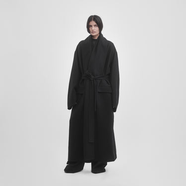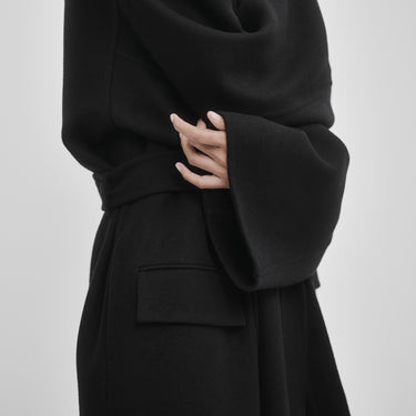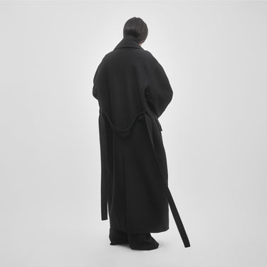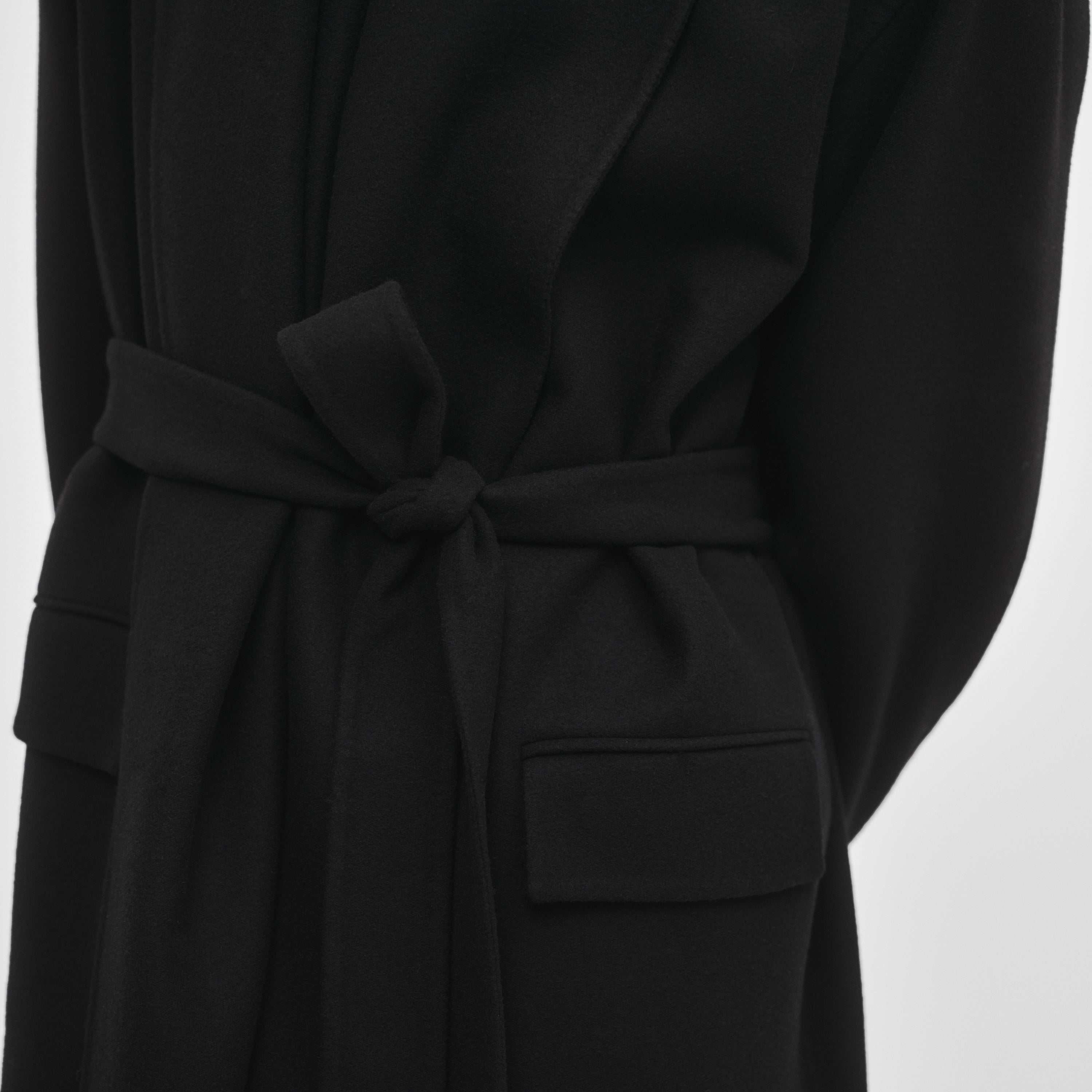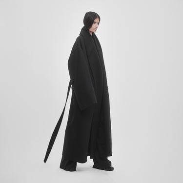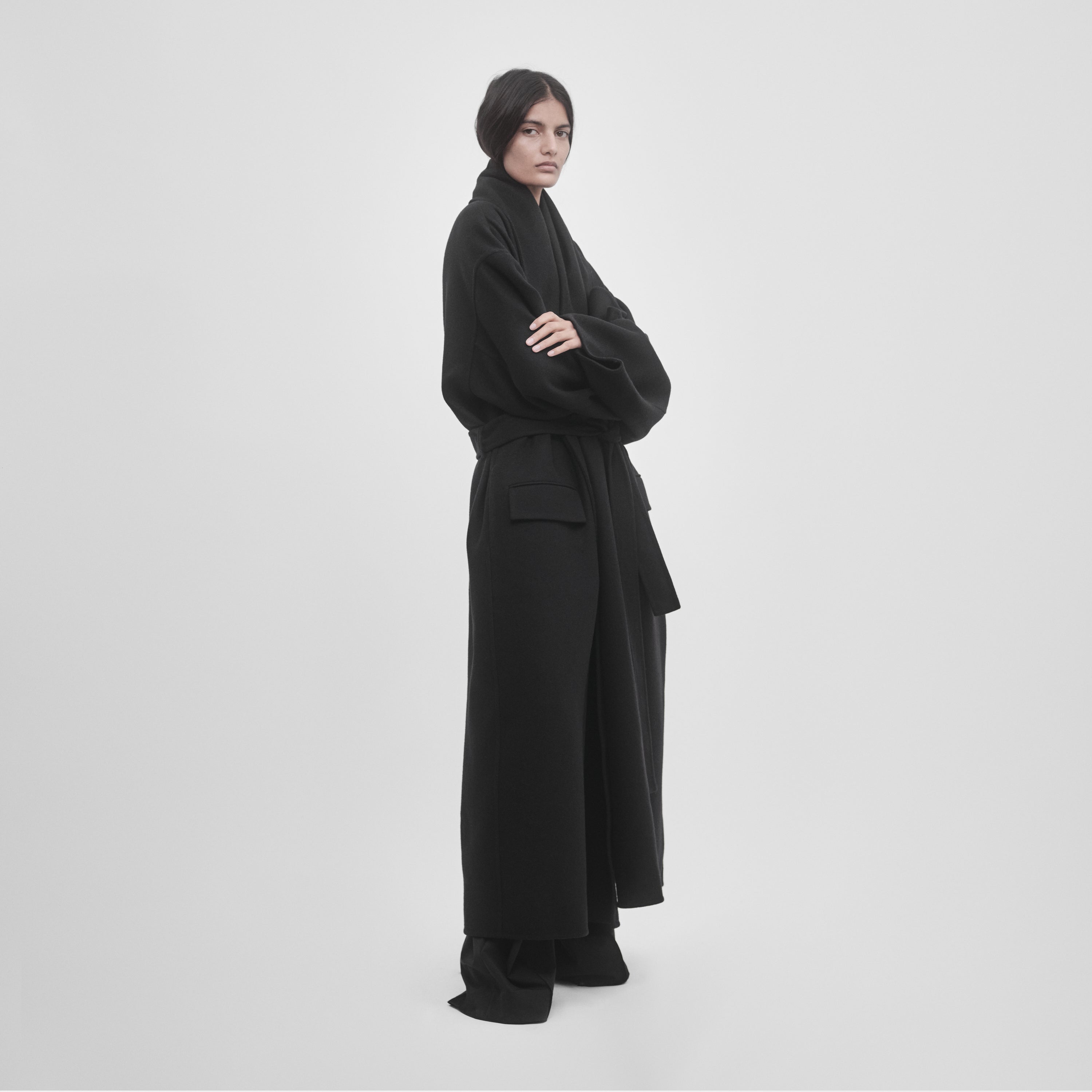 Black oversized double-face coat. Studied with a structured volume to be worn wrapped around the body and belted. Made in Italy in soft virgin wool.
