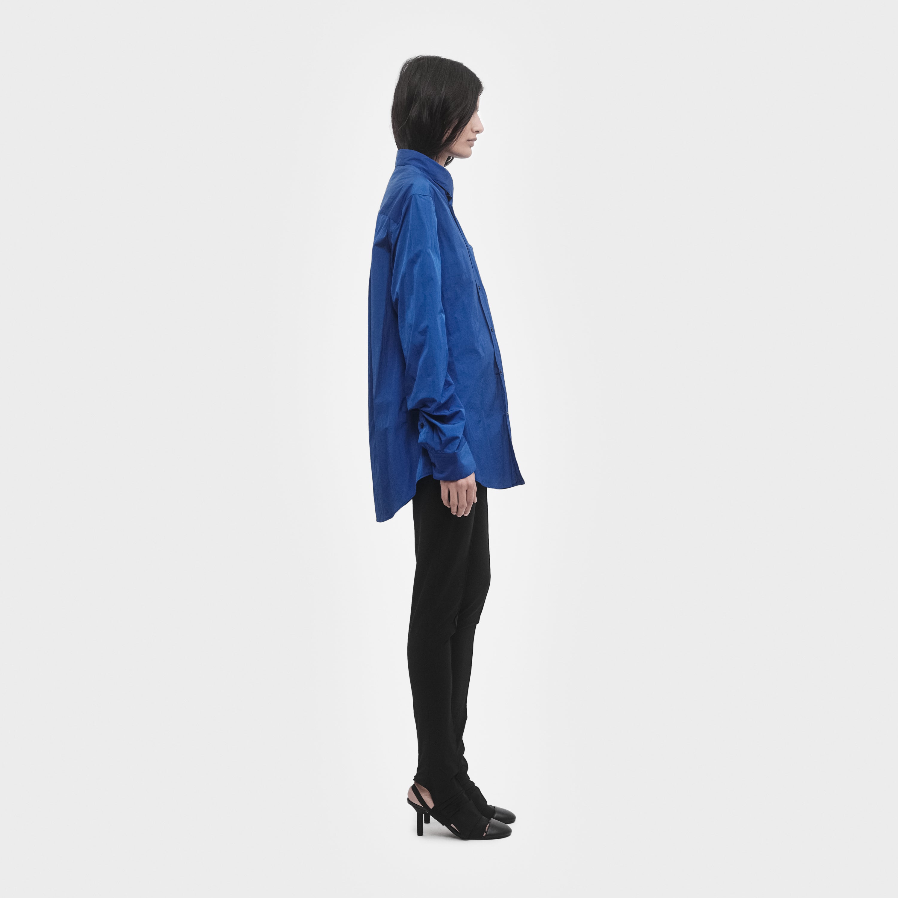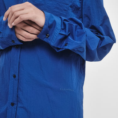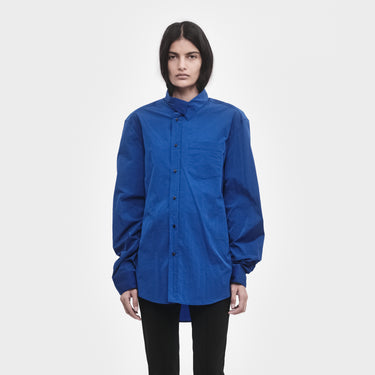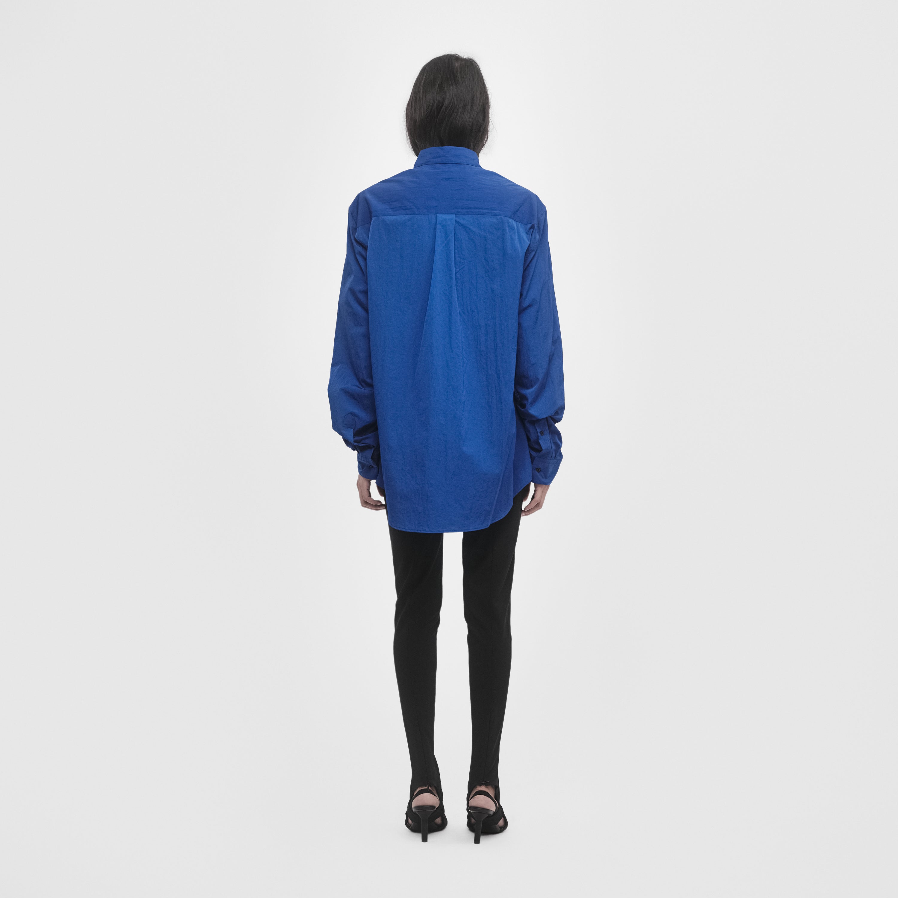 Overlapped-collar long-sleeve shirt crafted in lightweight technical nylon. The construction creates a precise and contemporary silhouette, while the overlapping neckline brings a sense of tension to the piece.