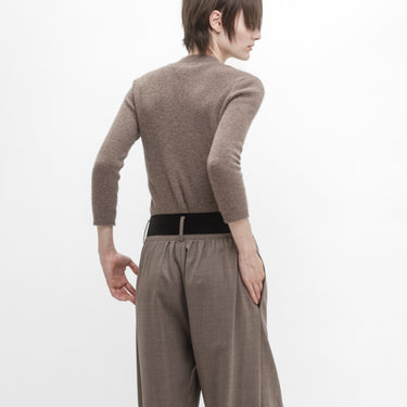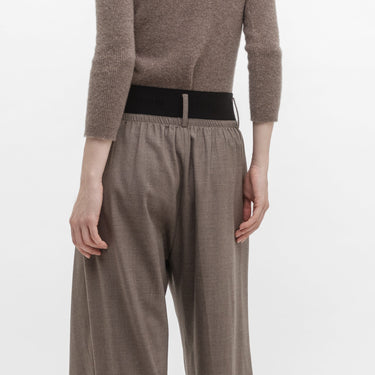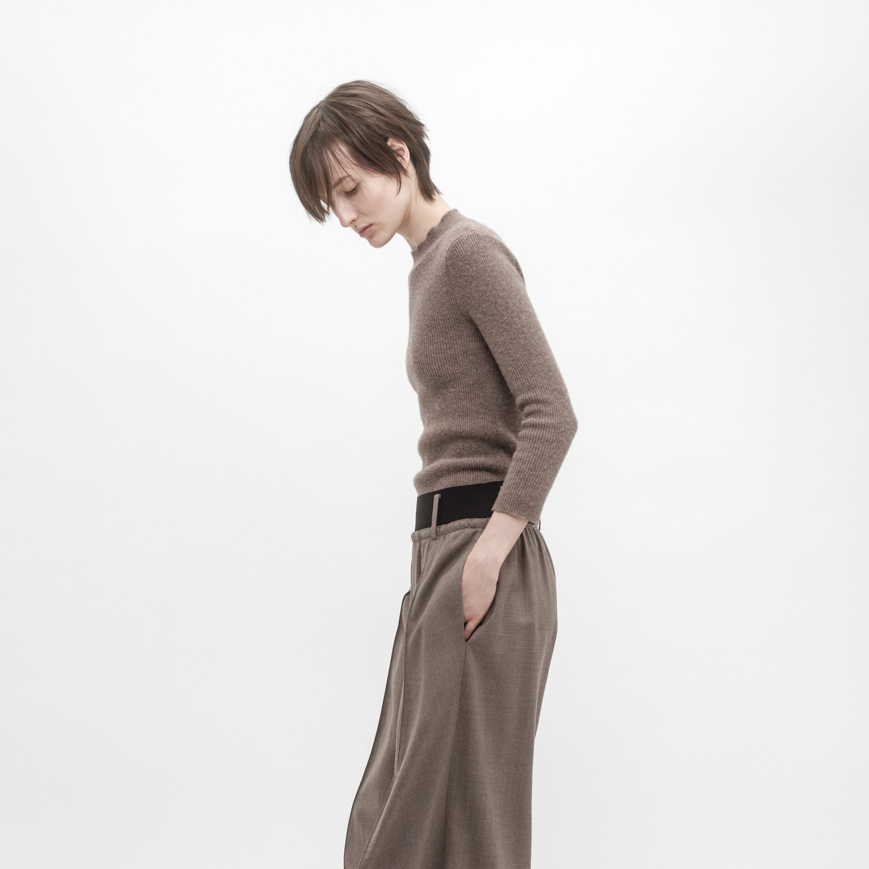 Relaxed fit trouser in light wool tailoring. Studied knee shape and elasticated waistband.