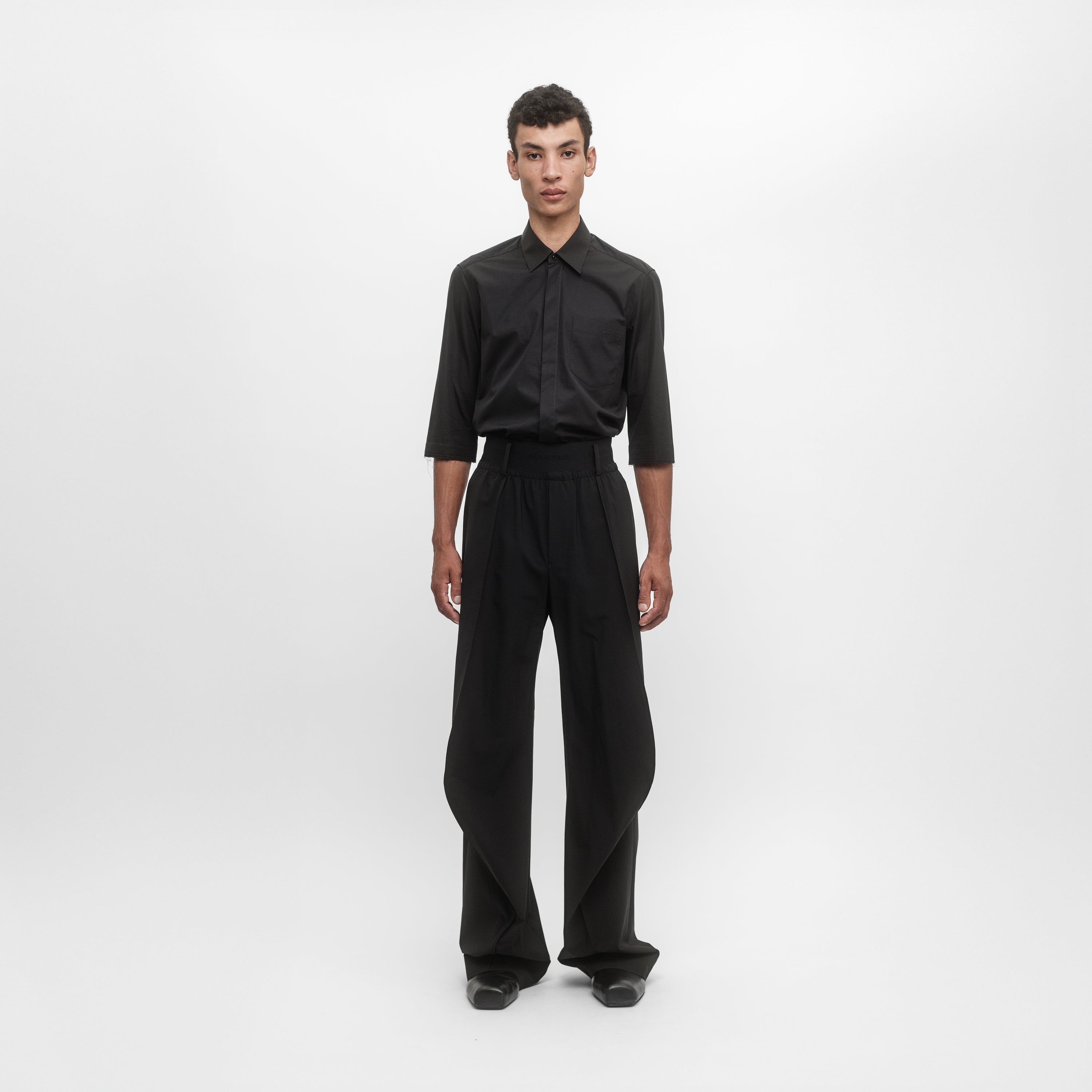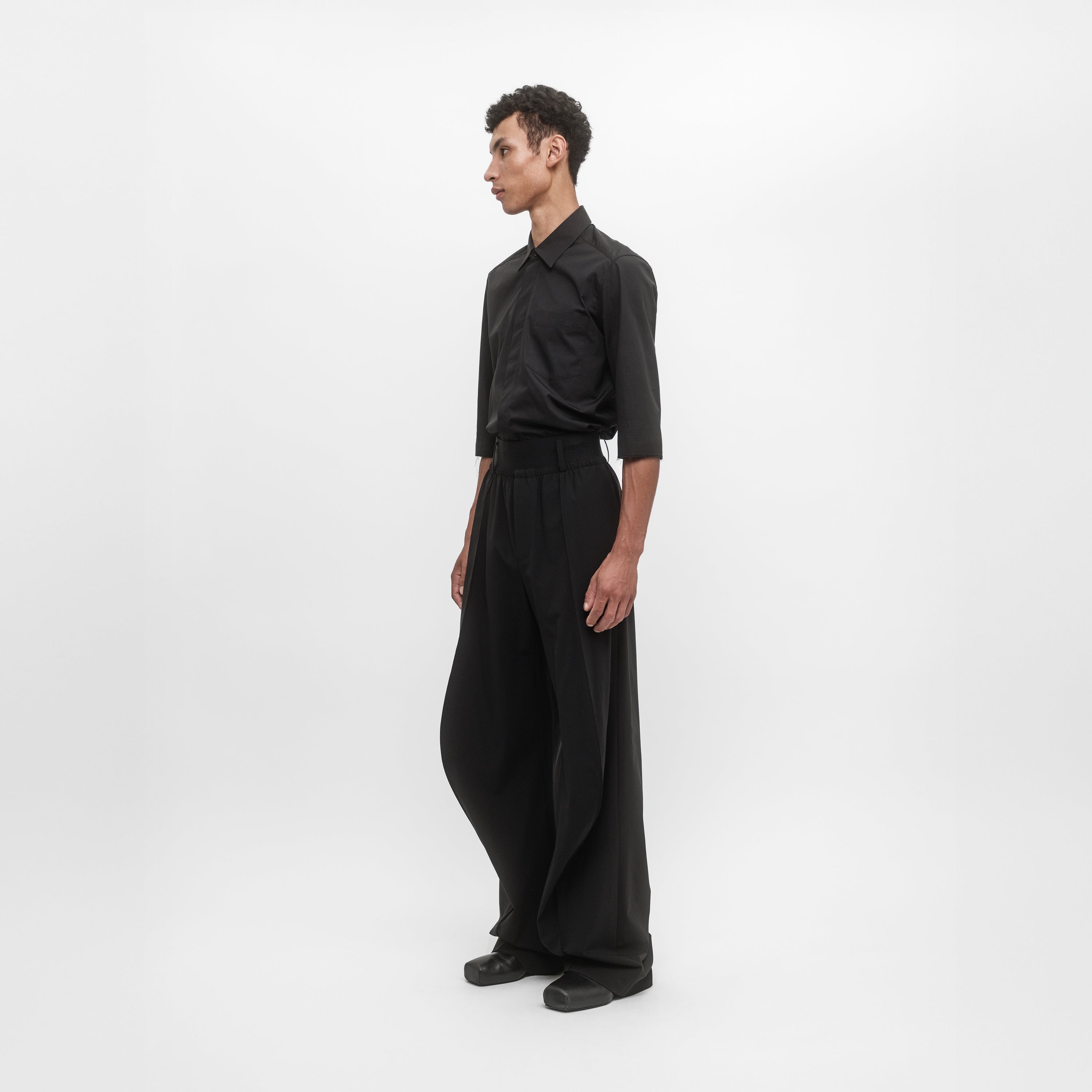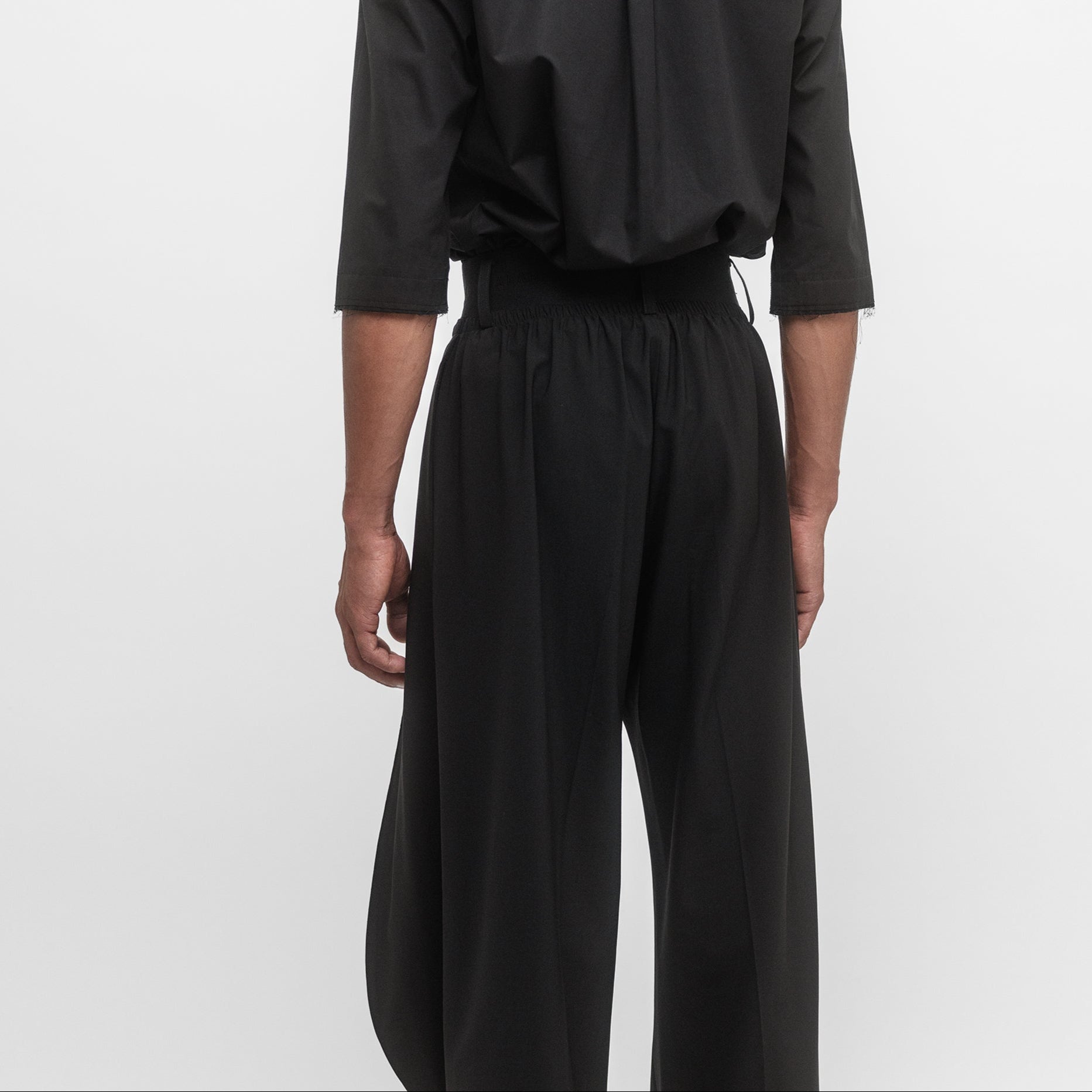 Relaxed fit trouser in light wool tailoring. Studied knee shape and elasticated waistband.