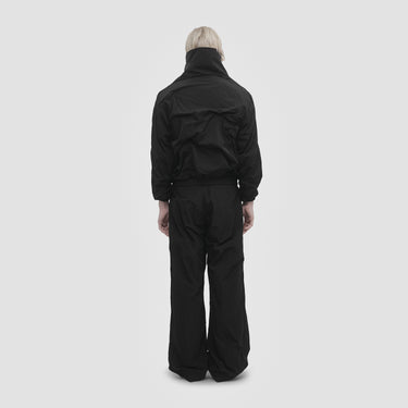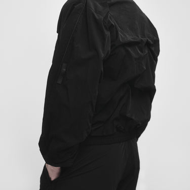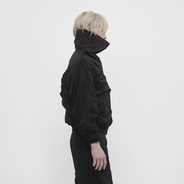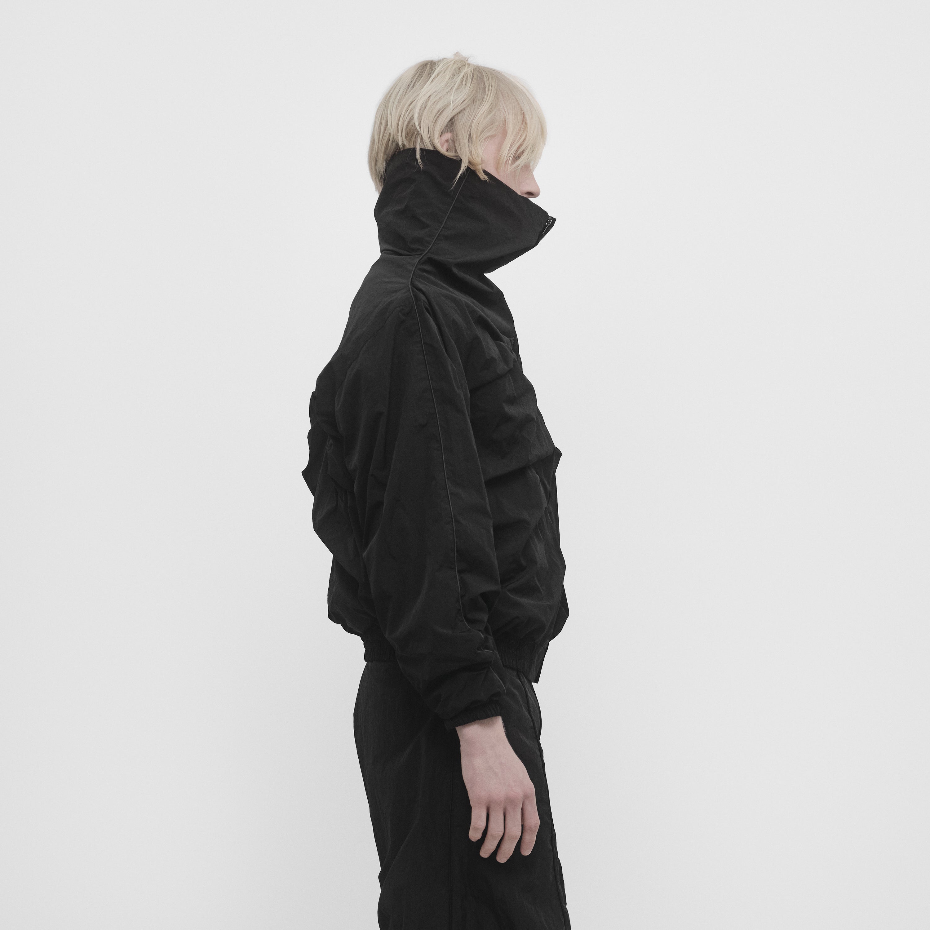 La veste en nylon exprime le concept de mouvement suspendu à travers des lignes sculptées et une coupe maîtrisée. Le volume étudié autour du col introduit une tension contenue, une impression d’anonymat préservé et de mouvement figé à mi-gestuelle.