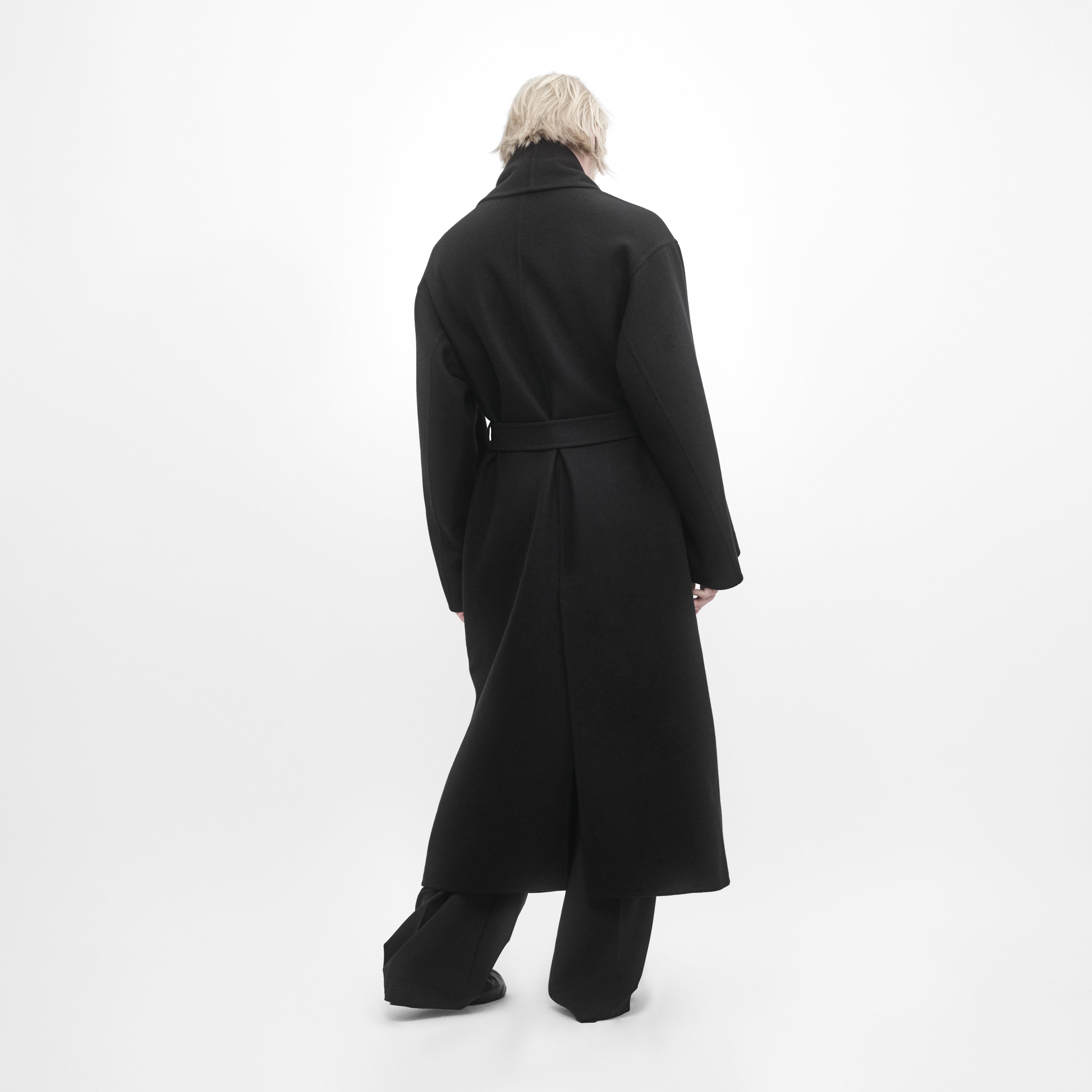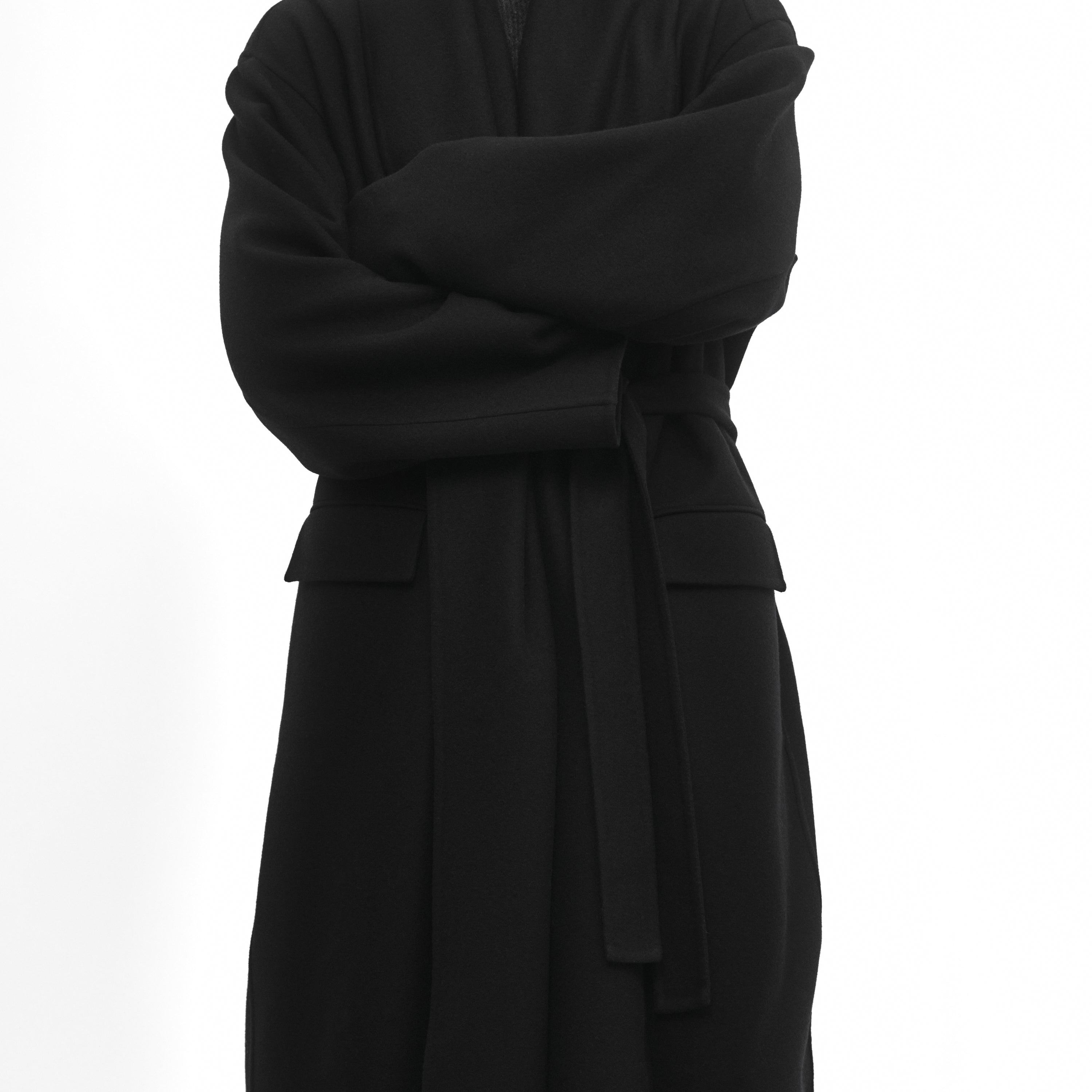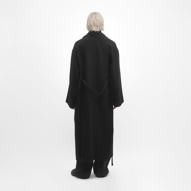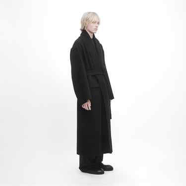 Manteau oversize double-face noir. Conçu avec un volume structuré pour être porté autour du corps et ceinturé. Fabriqué en Italie dans une laine vierge legére.