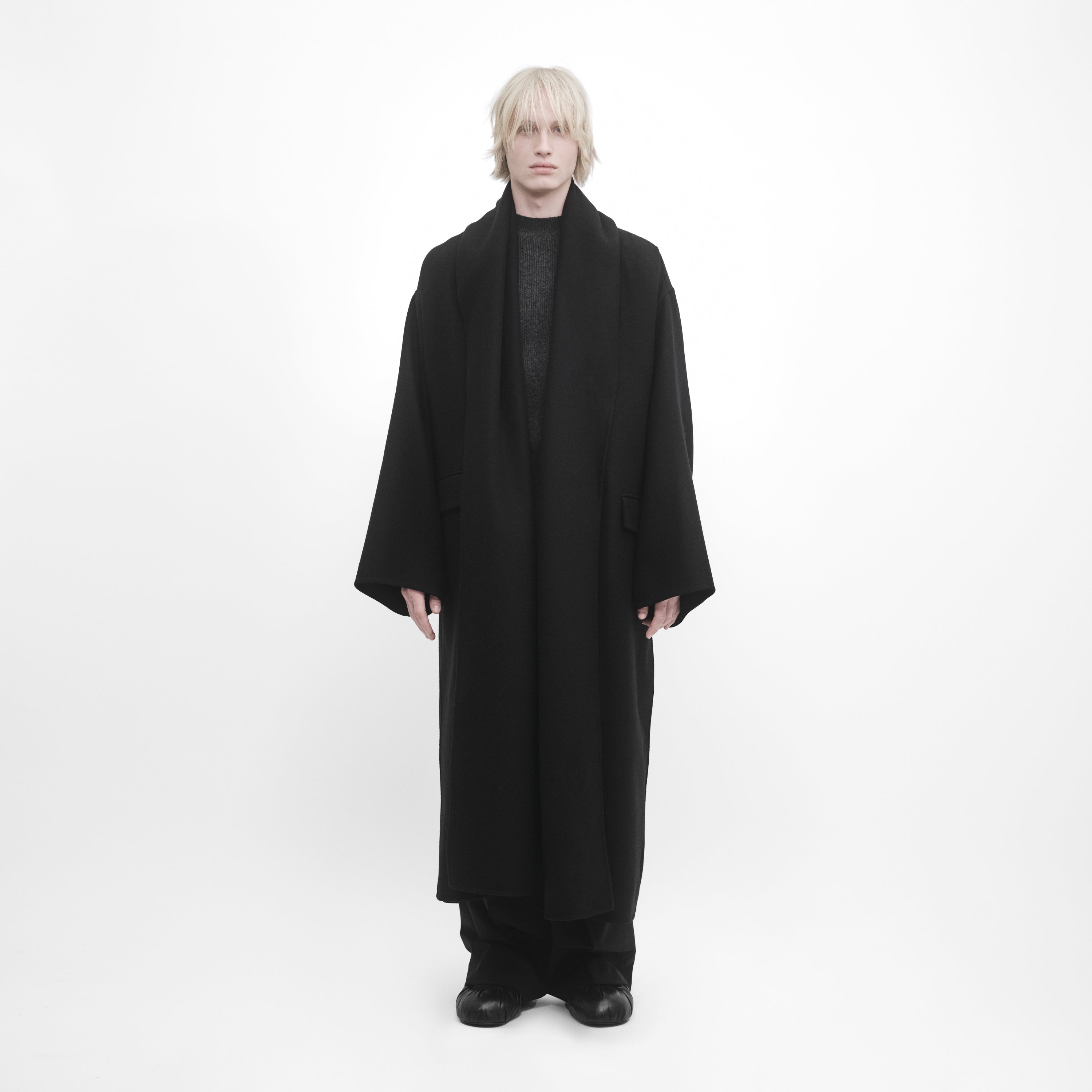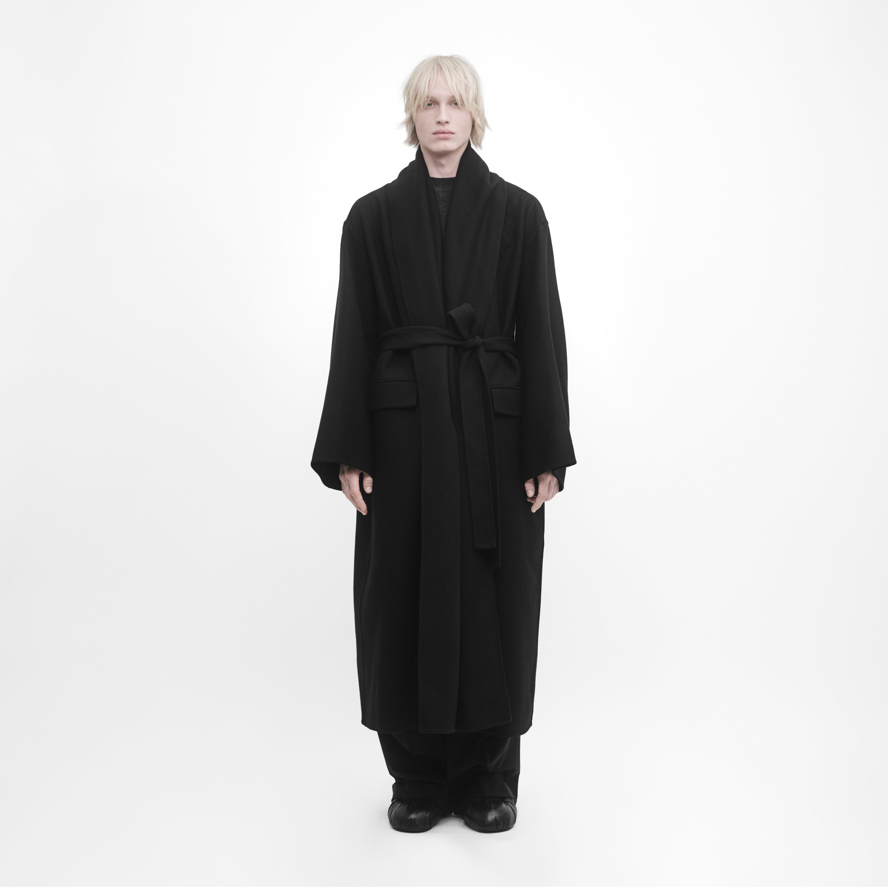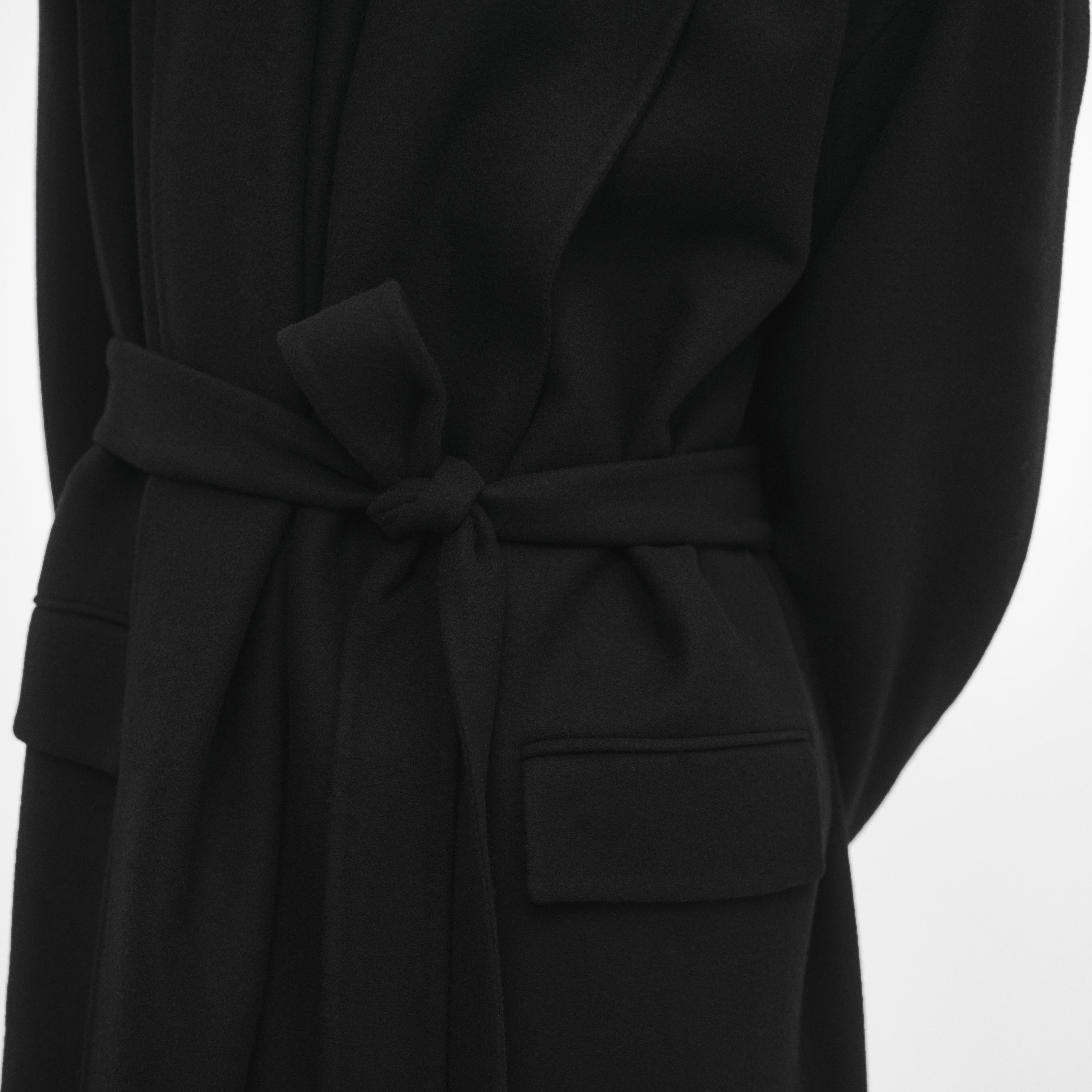 Manteau oversize double-face noir. Conçu avec un volume structuré pour être porté autour du corps et ceinturé. Fabriqué en Italie dans une laine vierge legére.