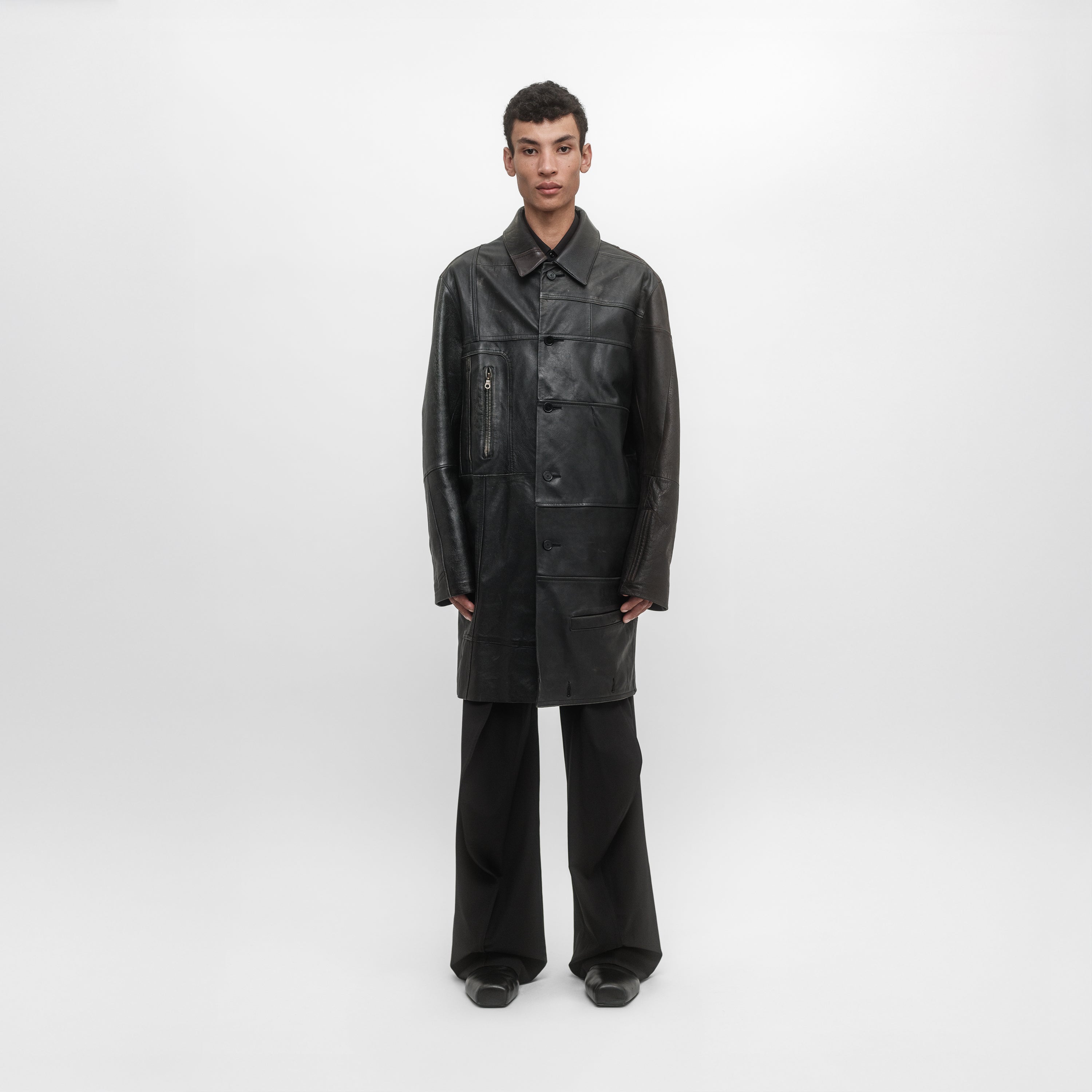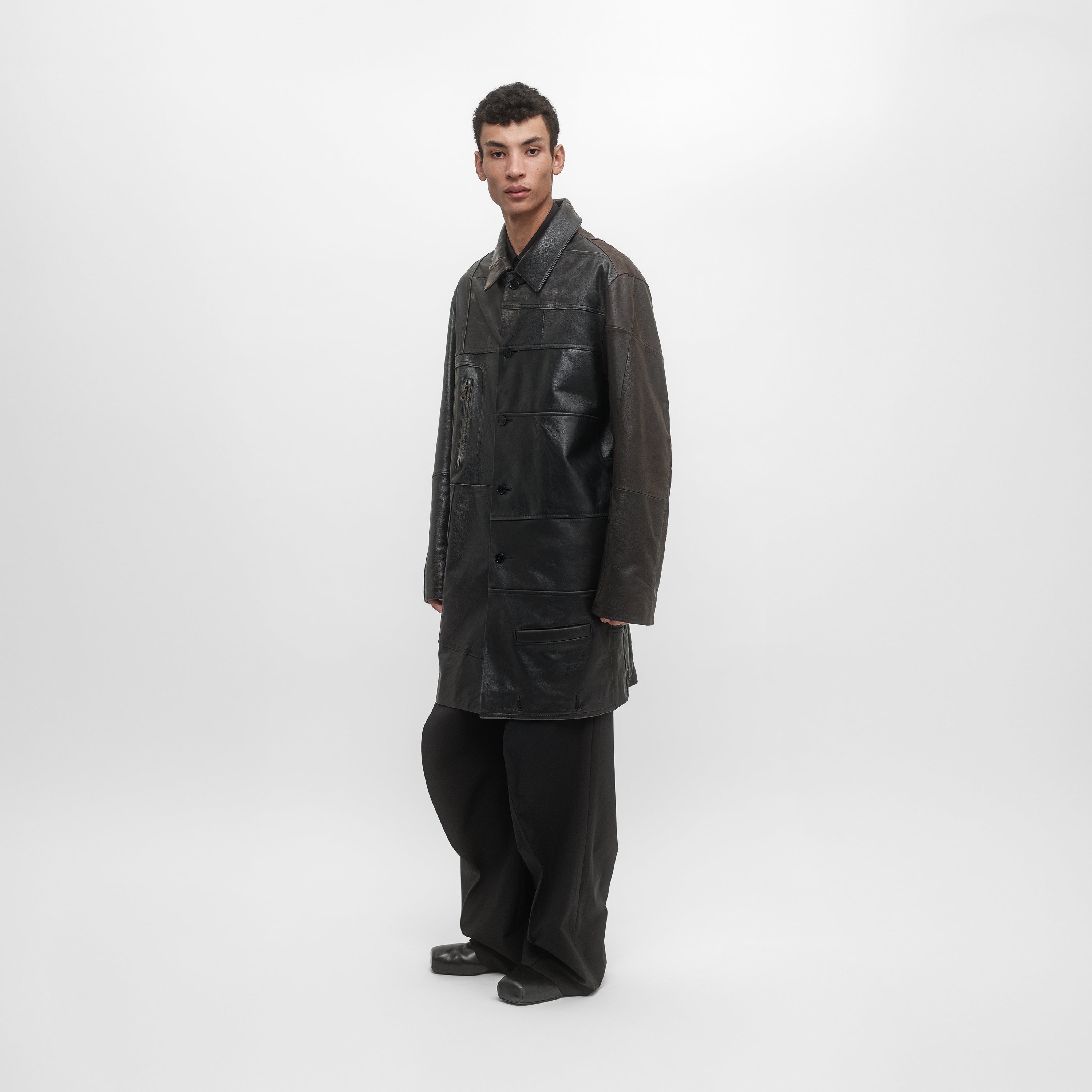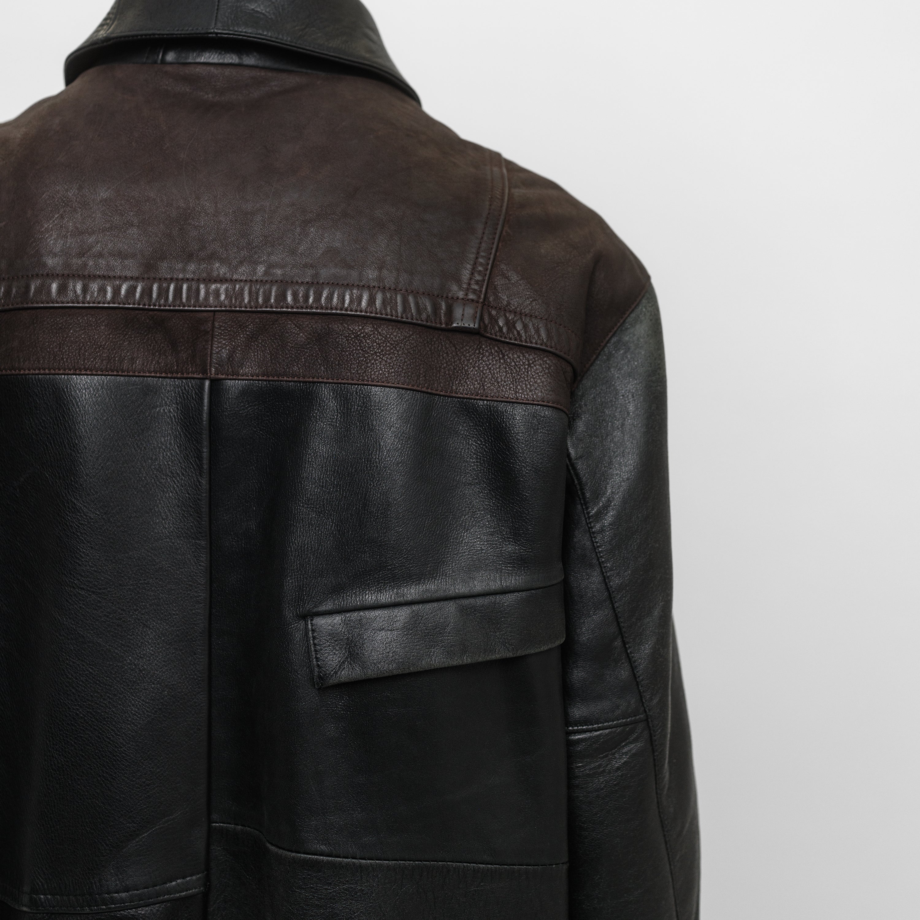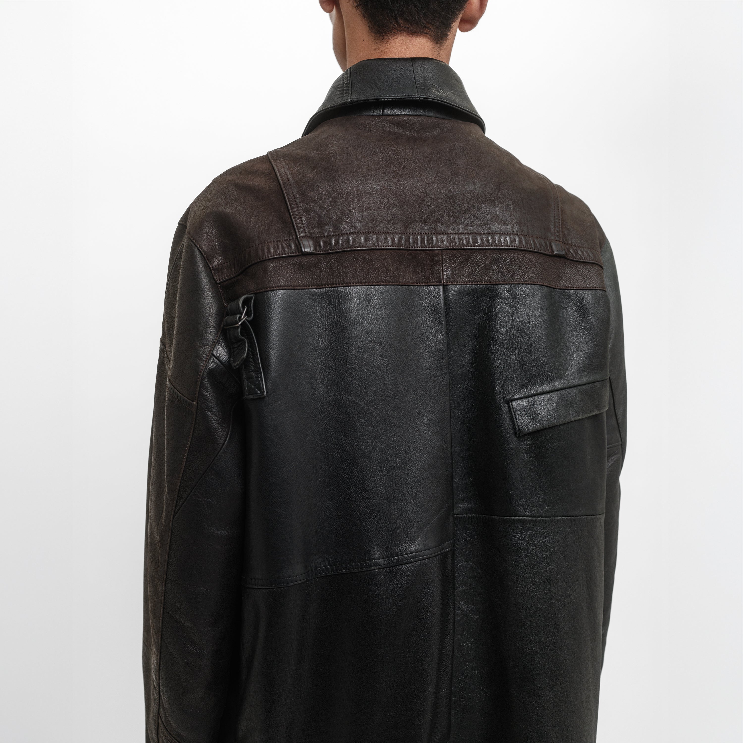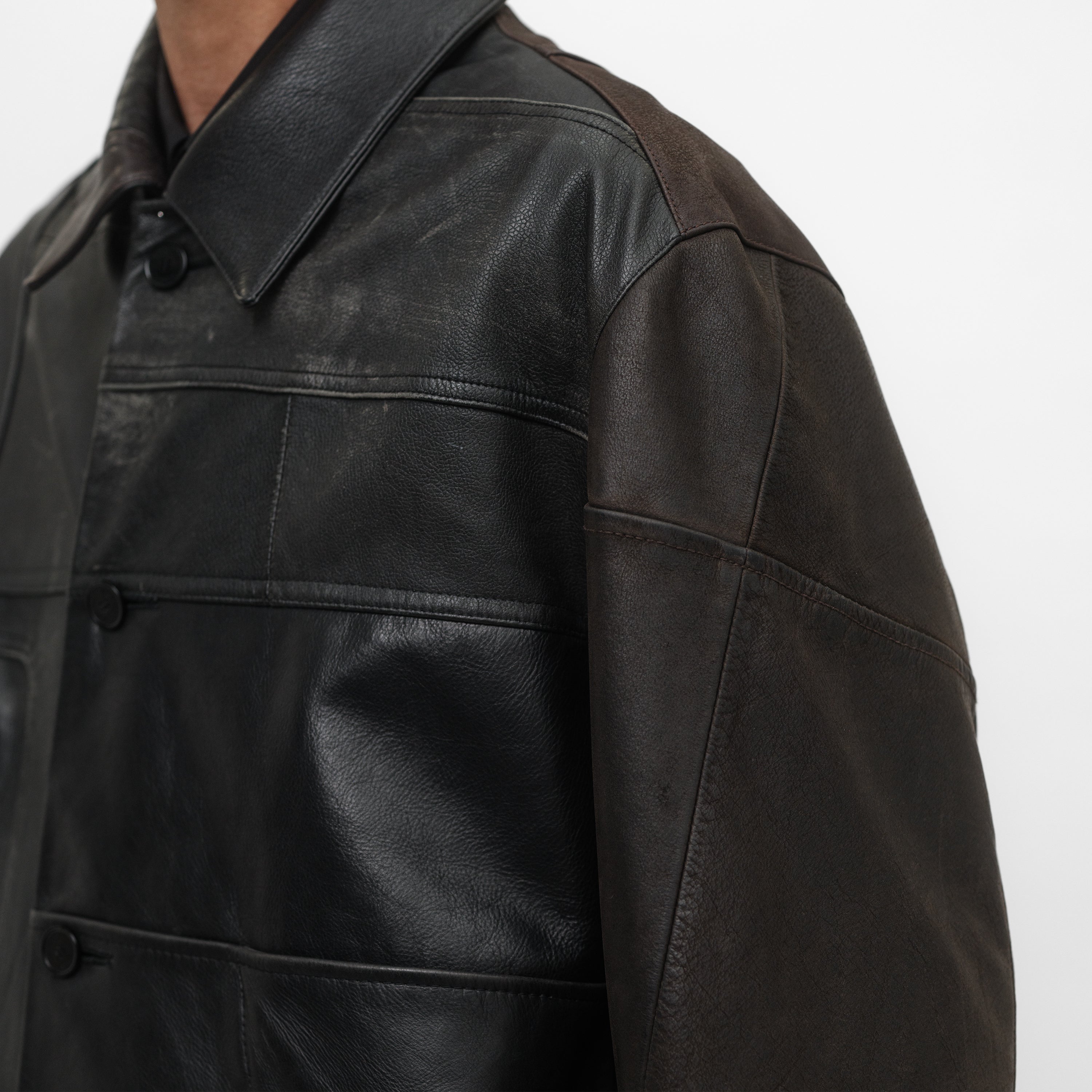 Conçu à partir de cuir vintage retravaillé avec une doublure noire, chaque pièce est unique. Réalisé à partir de vestes en cuir vintage authentiques aux tons marron et noir, chaque pièce conserve sa patine, son histoire et les détails de sa construction d’origine. Les variations subtiles de couleur et de détails rendent chaque pièce distinctive. Fabriqué en France.