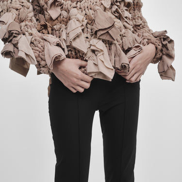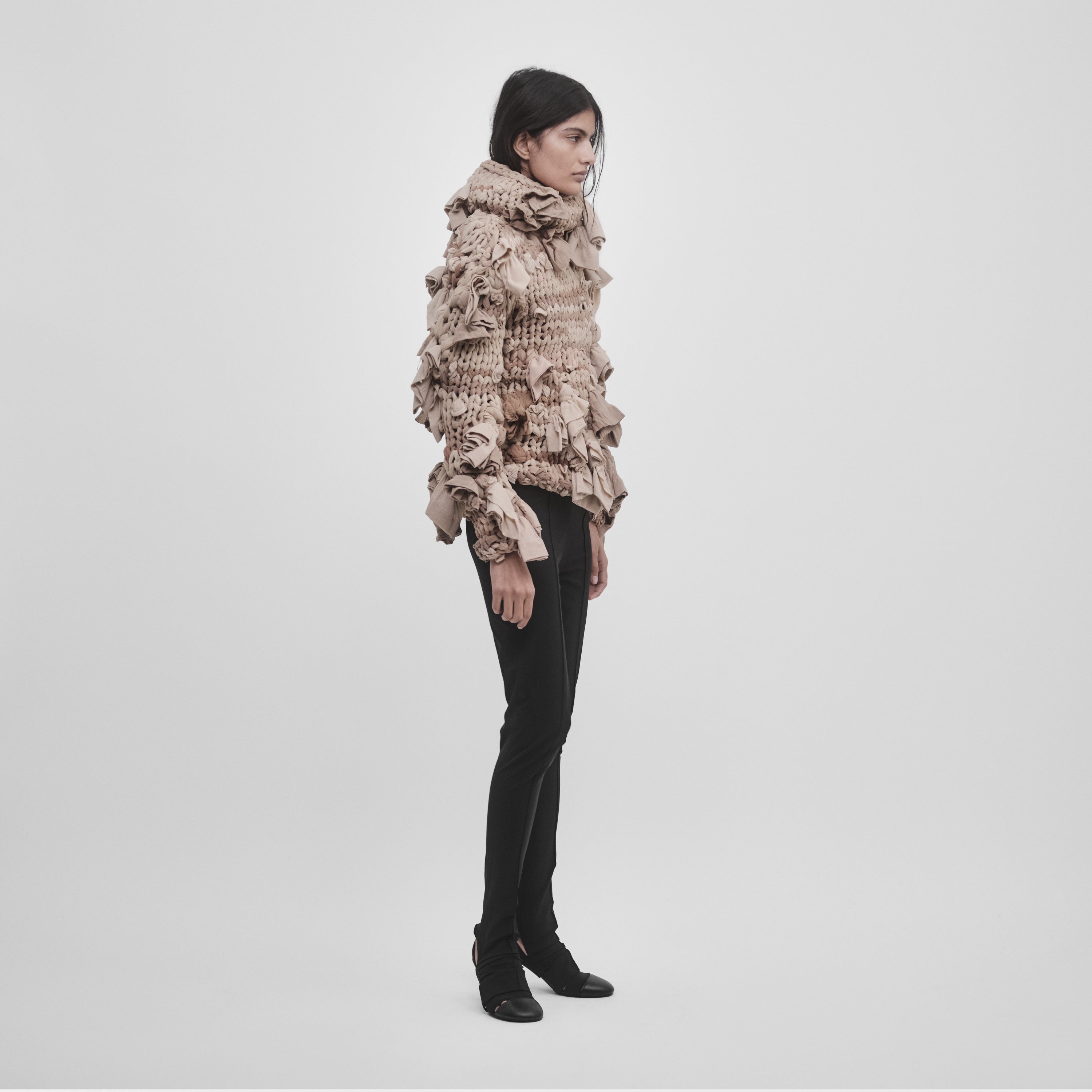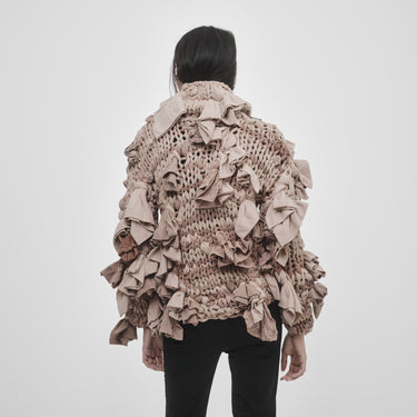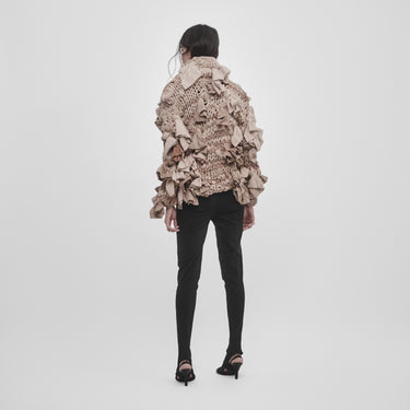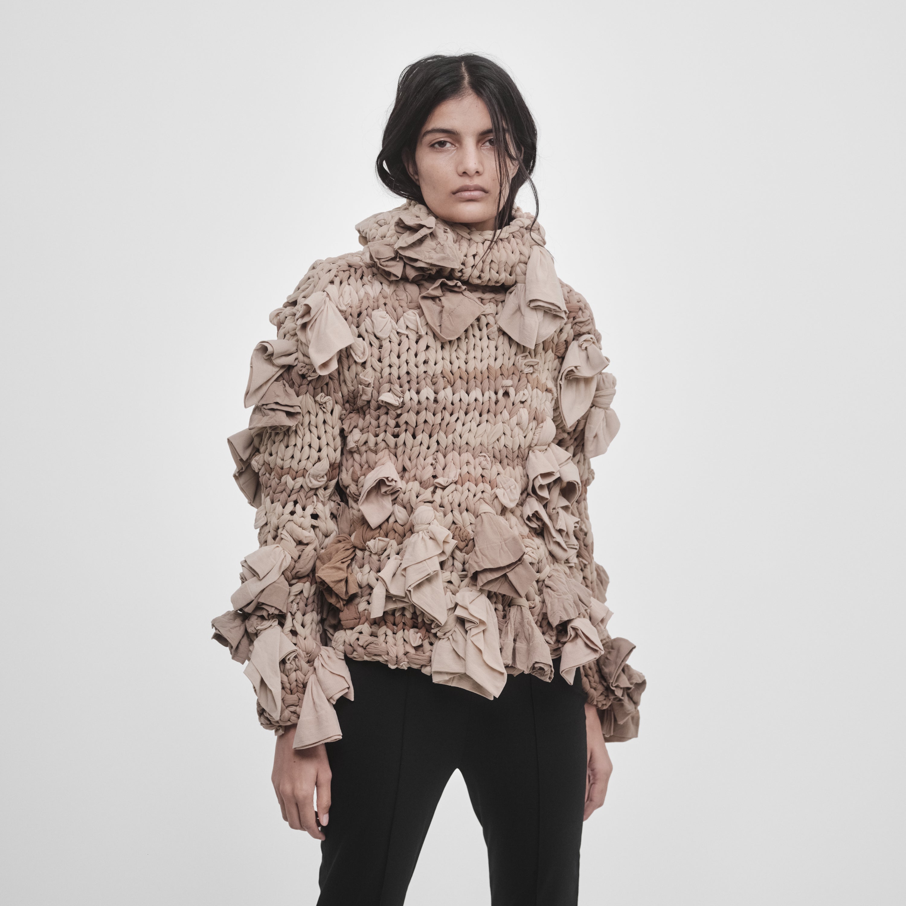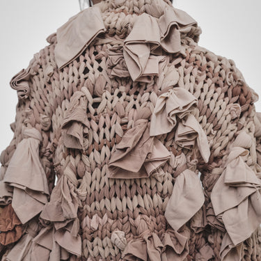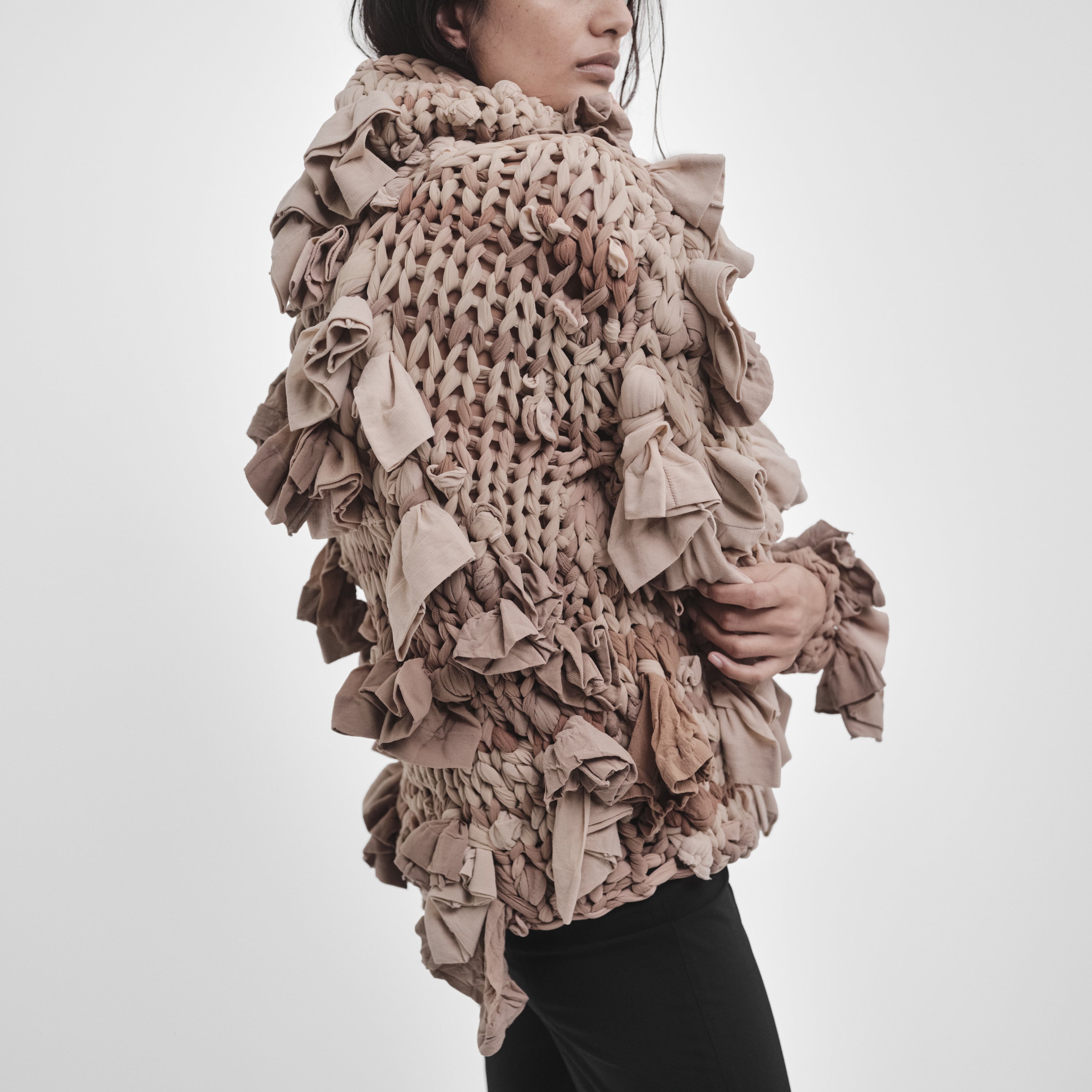 Artisanal hand-knit sweater crafted from tights deadstock. Each piece is unique, highlighting a raw and experimental approach to knitwear. Made in France.