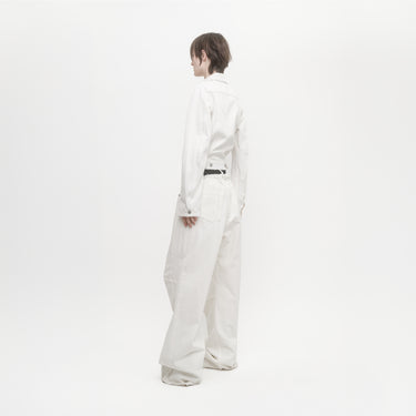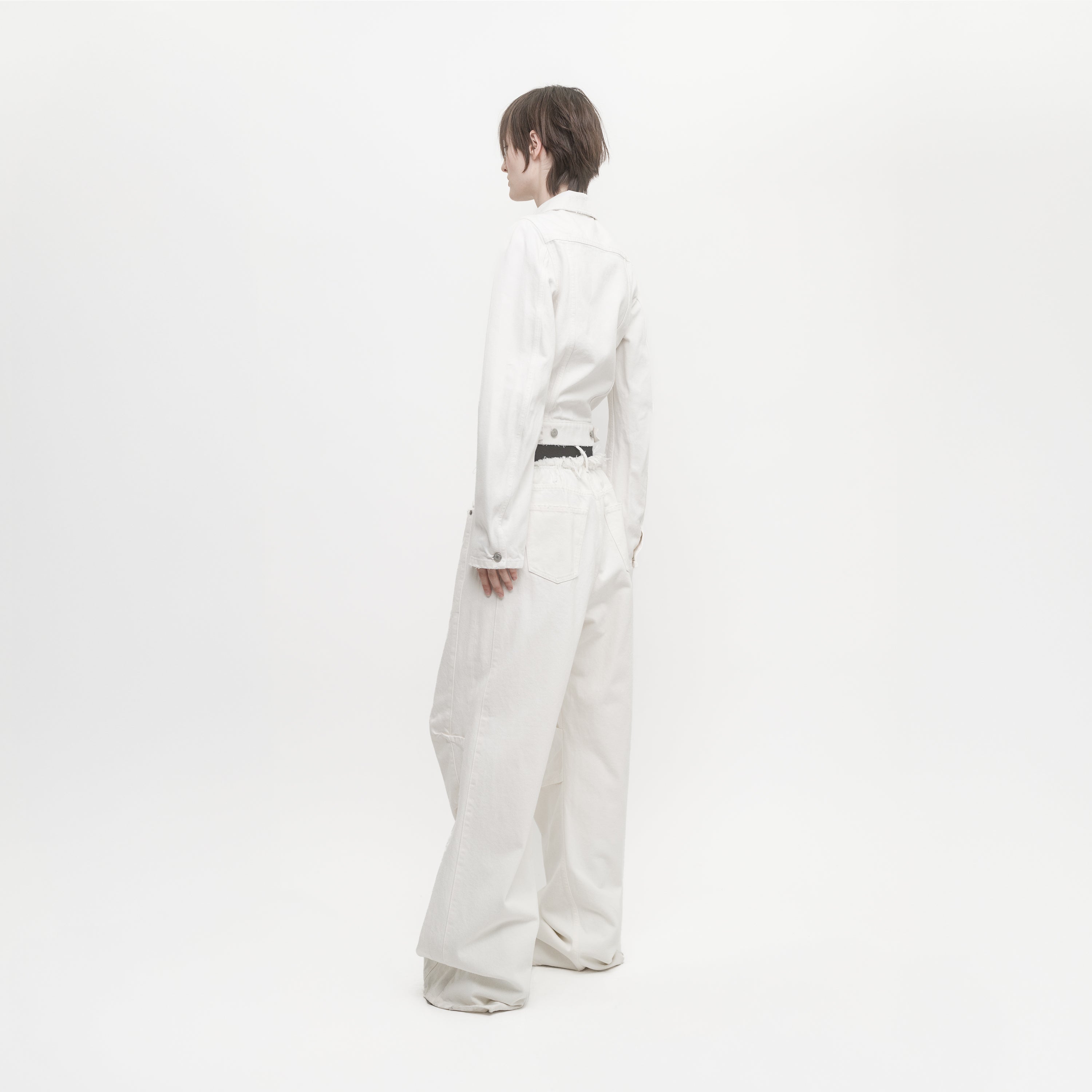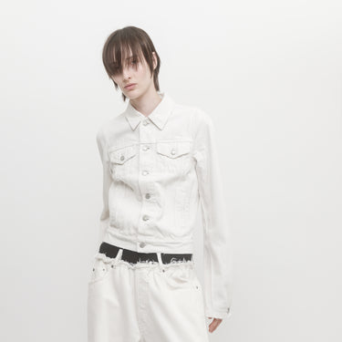 Slim-fit denim jacket with studied moulded shoulders with front flap pockets. Crafted from washed-out white cotton denim with a soft touch and tonal topstitching.